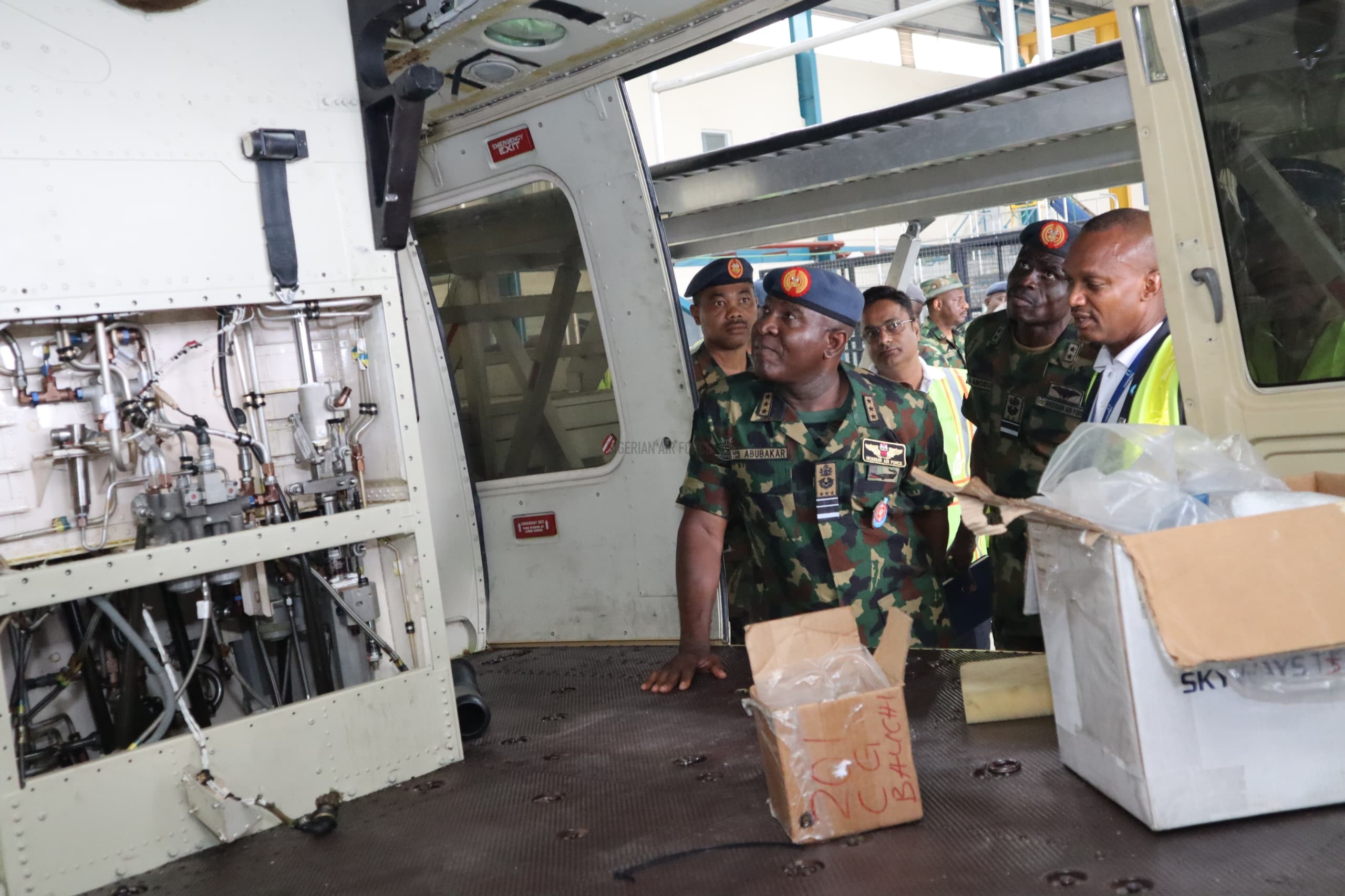 As part of his operational tour of Nigerian Air Force (NAF) establishments in Lagos, the Chief of the Air Staff (CAS), Air Marshal Hassan Bala Abubakar, on 13 December 2024, visited Caverton Helicopters Maintenance, Repair, and Overhaul (MRO) facility to evaluate progress on the ongoing 2,500-hour and 5-year major inspections of NAF Bell-412 helicopters (NAF 599 and NAF 600). The visit highlighted the critical role of indigenous expertise in advancing NAF’s operational capabilities and fostering sustainable aviation solutions.