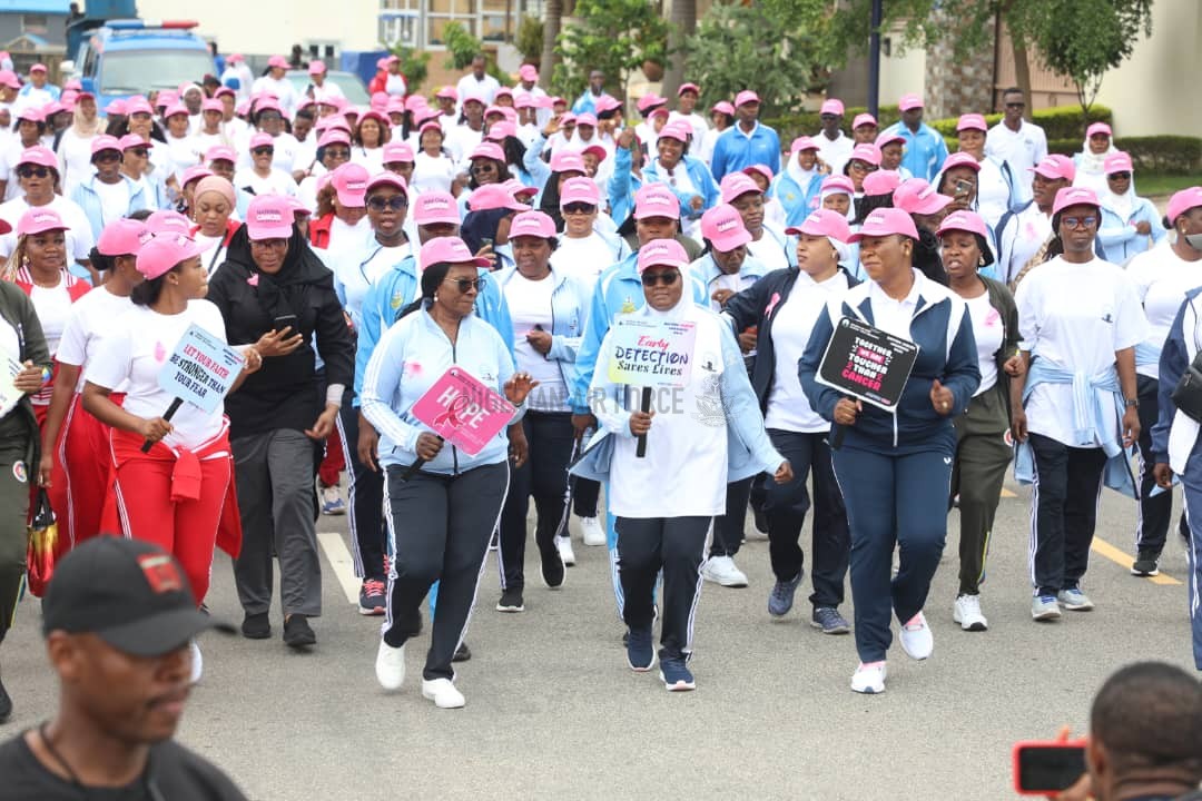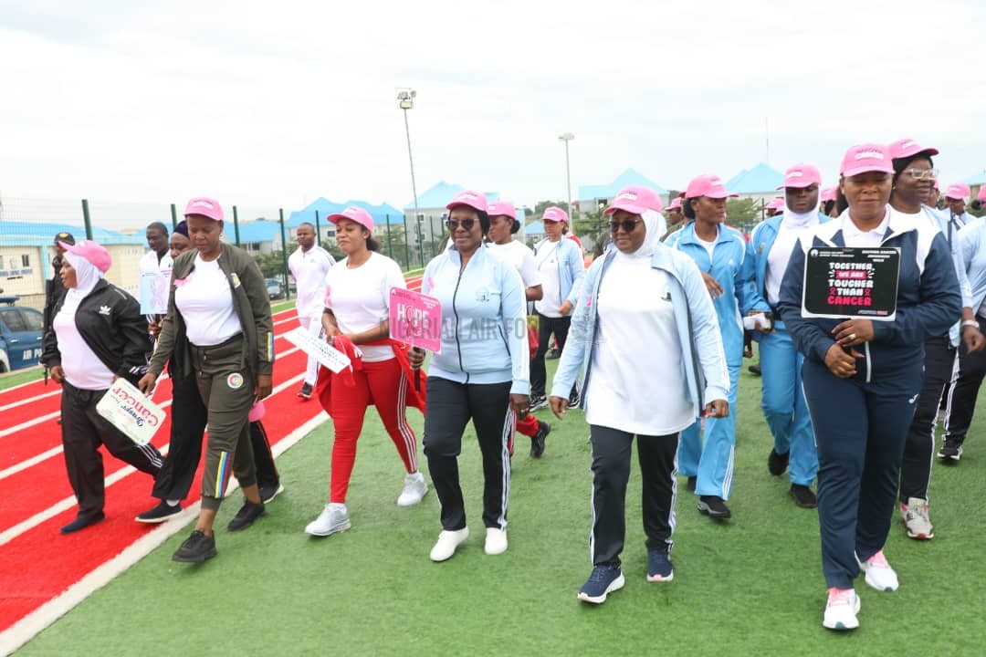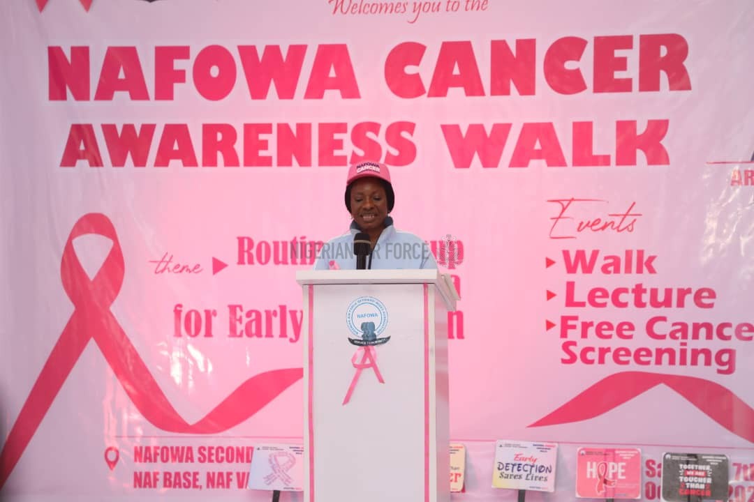 In commemoration of the 2023 Breast World Cancer Awareness Month, the Nigerian Air Force Officers’ Wives Association (NAFOWA) under the leadership of its National President, Architect (Mrs) Rakiya Abubakar has joined other well-meaning individuals, corporate and government entities worldwide to beam attention and raise awareness about the ravaging disease. To commemorate this year’s awareness month, the Association organised a one-day health walk, lecture and free cancer screening exercise in Abuja earlier today, 7 October 2023. Speaking at the lecture with the theme, “Routine Checkup, a Panacea for Early Detection,” Architect (Mrs) Rakiya Abubakar disclosed that in 2020 alone, available statistics by the World Health Organisation (WHO) revealed that about 78,899 cancer-related deaths were recorded in Nigeria while women often bear the brunt as breast and cervical cancers account for over 40 per cent of all cancer-related deaths. These statistics were, according to her, disturbing hence the need to pay greater attention and create awareness on the benefits of early detection, which is critical to the survivability of cancer patients. According to her, “Health experts have also noted that if cancer is detected early and in the localized stage, a patient has a high chance of survival. This is why NAFOWA has taken it upon itself to lend its voices towards creating awareness across our various barracks and communities.” Architect (Mrs) Abubakar also announced the approval of free cancer screening for wives of Air Force personnel and other Services on 9 October 2023 as well as 50 per cent discount for others from 10 -17 October 2023 at the NAFOWA Cancer Screening Centre situated at NAF Base, Bill Clinton Drive, Abuja.
